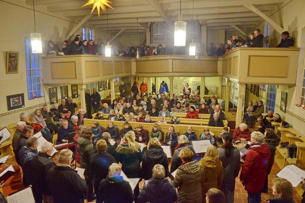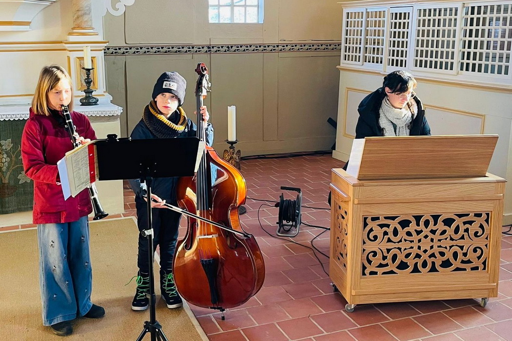 Die Kirche wird dann bestimmt wieder so voll wie letztes Jahr (links). Für den für den instrumentalen Teil des Adventskonzertes wird schon fleißig geprobt (rechts), (mit Martha Raulien, Janne Richter und Kerstin Raulien).