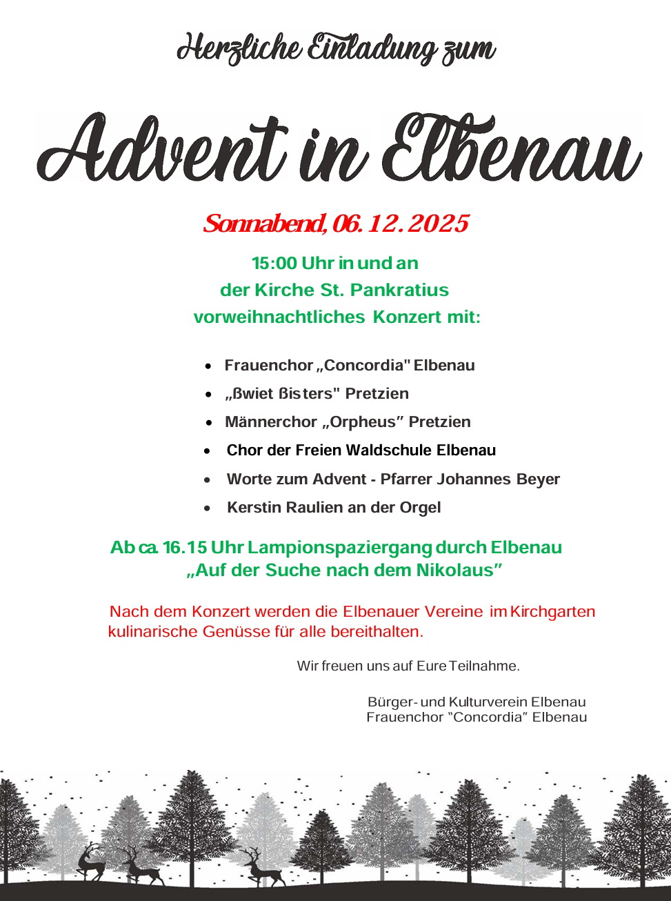 Nach dem Konzert gibt es draußen vor der Kirche den kleinen Elbenauer Adventsmarkt, mit Waffeln, Speisen vom Grill und Glühwein – und einem Lampiongumzug "auf der Suche nach dem Nikolaus" für die Kleinen.