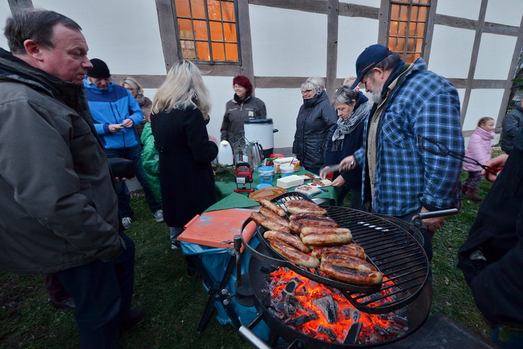 | Noch während des Konzertes heizten die fleißigen Hände der Mitglieder des Sportvereins den Grill an, der Bürger- und Kulturverein kümmerte sich um die heißen Getränke. So zogen gegen Ende des Konzertes schon verlockende Düfte in die Kirche. Viele Gäste des Adventskonzerts nahmen die Einladung zu Glühwein und Grillwürsten an. |