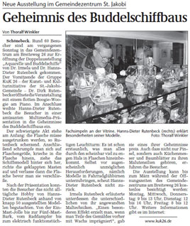 In der zweiten Ausstellung des KuK 26 waren Buddelschiffe von Dr. Hanns-Dieter Rutenbeck und Aquarellmalerei von Dr. Irmela Rutenbeck zu sehen. Die Volksstimme berichtete über die Ausstellungseröffnung und stelte den Buddelschiffbauer und seine Technik vor.