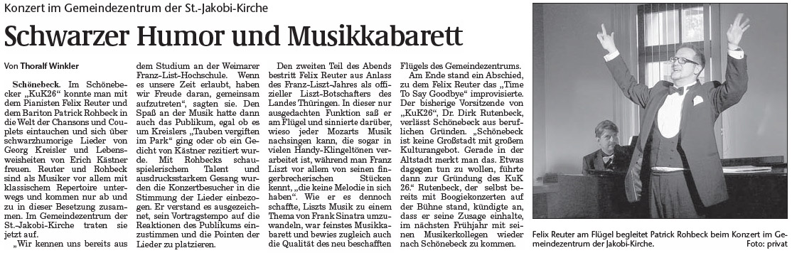 Am 29. Mai 2011 gab es einen Abend mit schwarzen Humor, Liedern von Kreisler, Kästner und Reutter und als zweiten Teil des Konzertes Musikkabarett mit Thürigens Liszt-Botschafter. Lesen Sie dazu den Bericht in der Volksstimme. (anklicken zum Vergrößern)