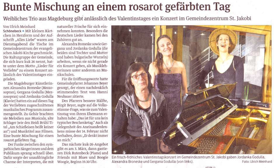 Am Valentinstag waren die Magdeburger Mezzosopranistinnen Gergana Godulla und Alexandra Broneske, begleitet von Jordanka Godulla am Klavier zu Gast im KuK26. Sie präsentierten Lieder aus Musical und Film, die sie passend zum Tag der Verliebten ausgewählt hatten. Von ihrer lebendigen Art die Lieder vorzutragen war das Publikum begeistert.Lesen Sie dazu den Bericht von Ulrich Meinhard in der Schönebecker Volksstimme.