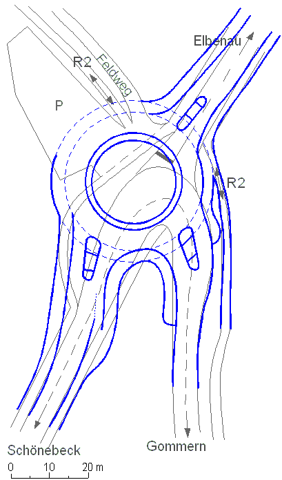 Maßstäbliche Skizze der vermutlich geplanten Ausführung des Radwegendes, nach telefonischer Auskunft des LB Bau vom 4.11.2007, und daraus resultierende Radverkehrsführung (blau) in der Hauptrichtung des Radverkehrs. Rot eingetragen ist die notwendige bauliche Änderung gegenüber dem bestehenden Zustand (2,5 m breite Mittelinsel) die an dieser Stelle zur sicheren Überquerung mindestens erforderlich wäre. Diese soll nach neuester Mitteilung aber ersatzlos entfallen (der Platz dafür dürfte ohnehin fehlen). |